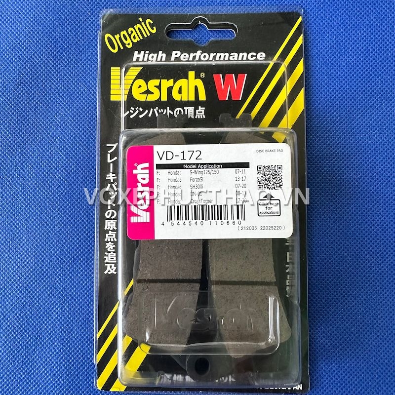 - Bố thắng Resin của Vesrah được sản xuất dựa trên thông số kỹ thuật của bố thắng OEM nhằm mang lại sự tương thích tối đa.